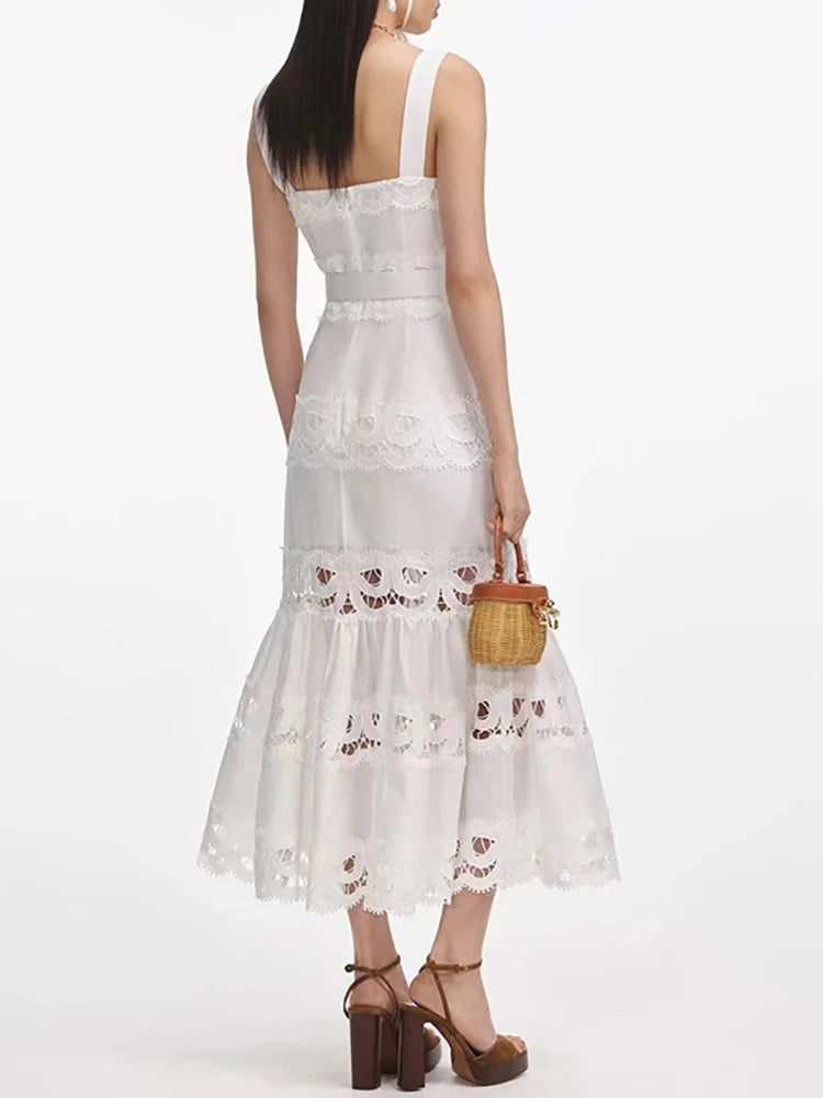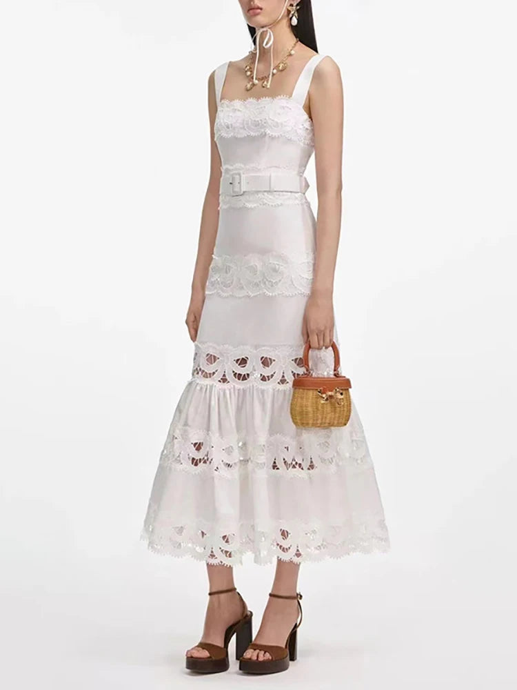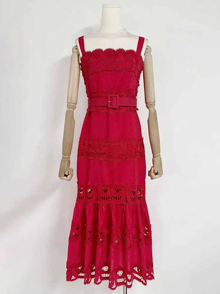 Refined and romantic, the Trend4us Elegant Lace Belted Patchwork Midi Dress features intricate lace paneling, wide shoulder straps, and a flared tiered hem for a timeless silhouette. Designed with a tonal waist belt to accentuate the figure, this dress is perfect for garden parties, summer events, or elegant daytime looks. Available in classic white, bold red, and sleek black.