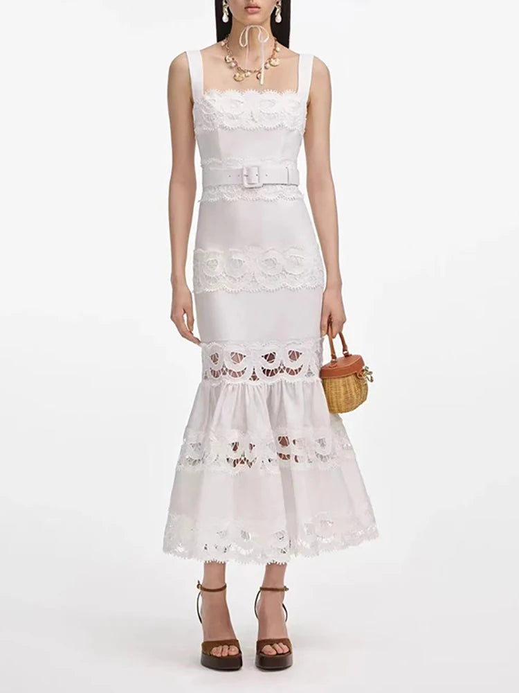 Trend4us Elegant Lace Belted Patchwork Midi Dress