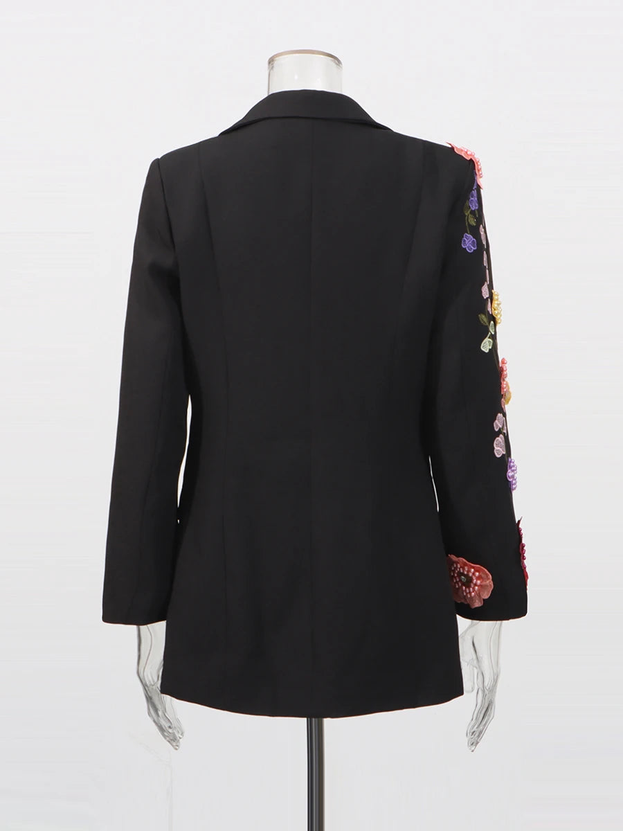 Elevate your statement style with the Trend4us Luxe Floral Beaded Embroidery Blazer — a masterpiece of craftsmanship and elegance. This tailored black blazer features a dramatic cascade of multicolor floral appliqués, intricately embroidered with 3D beaded accents and crystal centers. The structured silhouette and single-button closure create a sleek, polished look that’s perfect for galas, fashion events, or artistic power dressing.