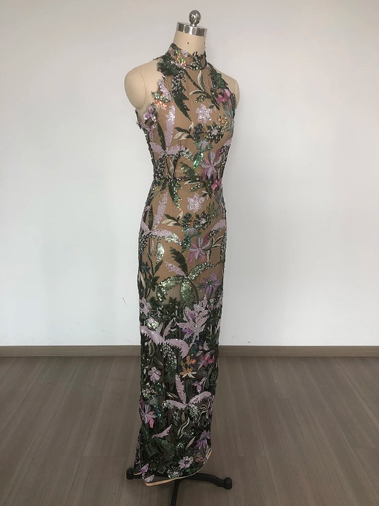 The sheer mesh fabric is adorned with dazzling multicolored floral embroidery and sequins, creating a mesmerizing garden-like effect. Every detail—from the delicate placement of flowers to the shimmering accents—adds depth, texture, and a sense of artistry to the look. The dress is fully lined in all the right places for coverage while maintaining its alluring sheer aesthetic.