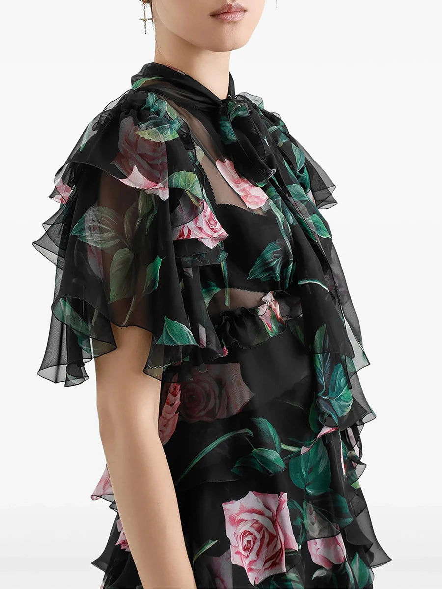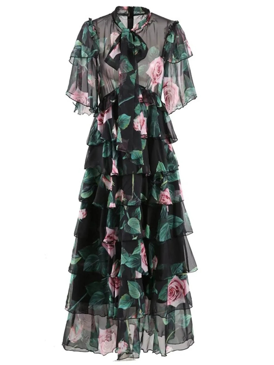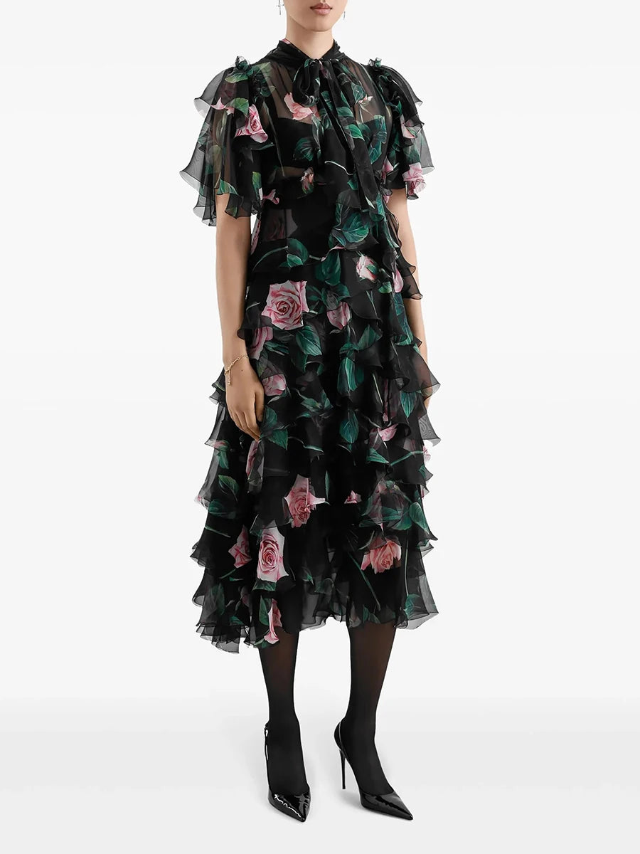 Embrace elegance with the Trend4us Luxe Sheer Floral Ruffle Midi Dress, featuring a sheer black overlay adorned with romantic rose prints. Delicate ruffled tiers cascade throughout the silhouette, while the short flutter sleeves and bow-tie neck detail add a feminine touch. The midi length and layered design create graceful movement, perfect for garden parties, weddings, or evening events.