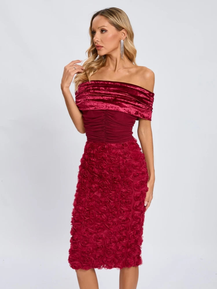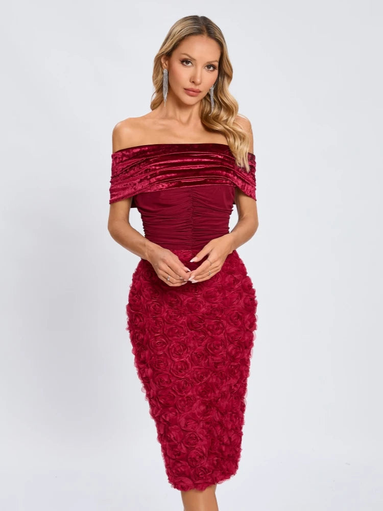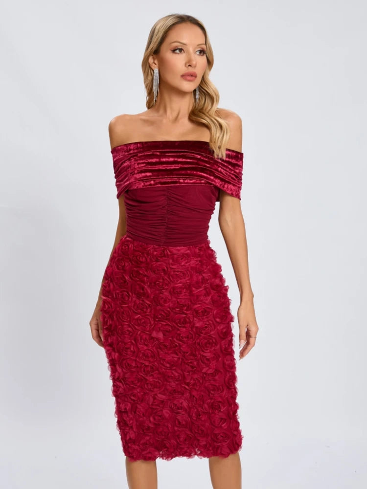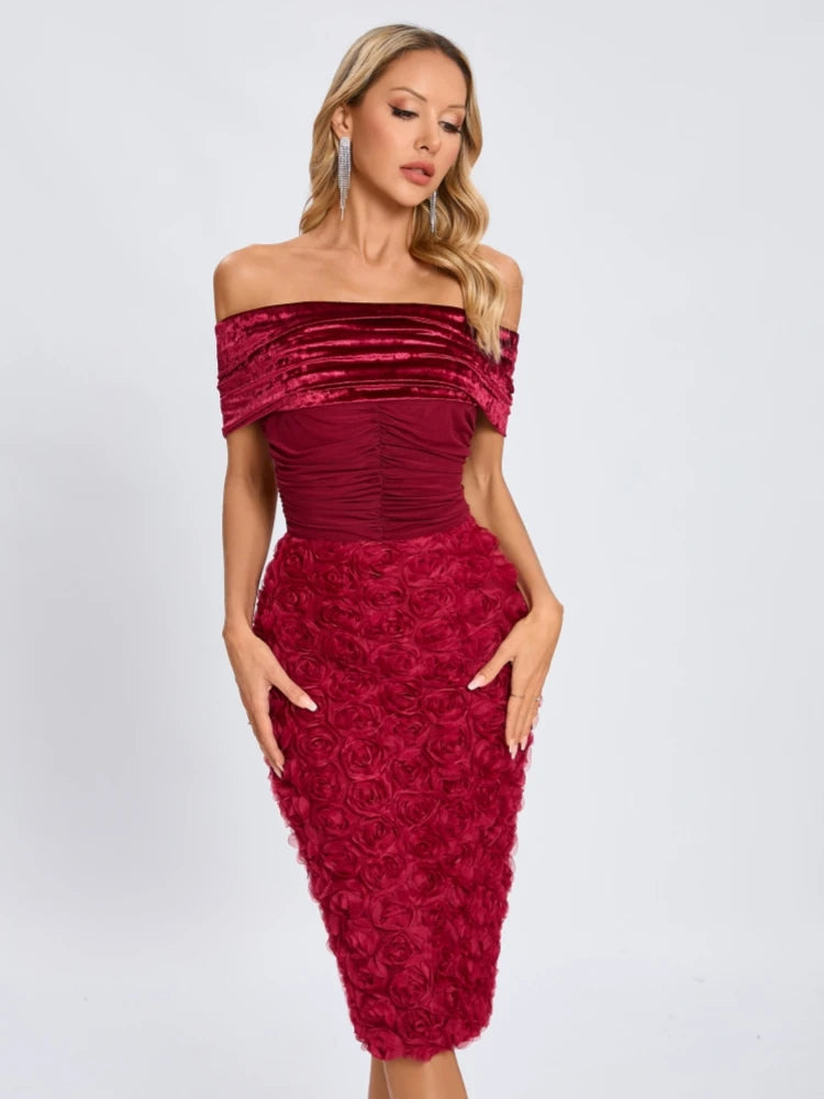 Elevate your style with the Trend4us Luxe Velvet Off-Shoulder Rose Appliqué Dress, a masterpiece of elegance and sophistication. This stunning dress features a luxurious off-shoulder velvet bodice that beautifully drapes to highlight your neckline and shoulders, exuding timeless charm.