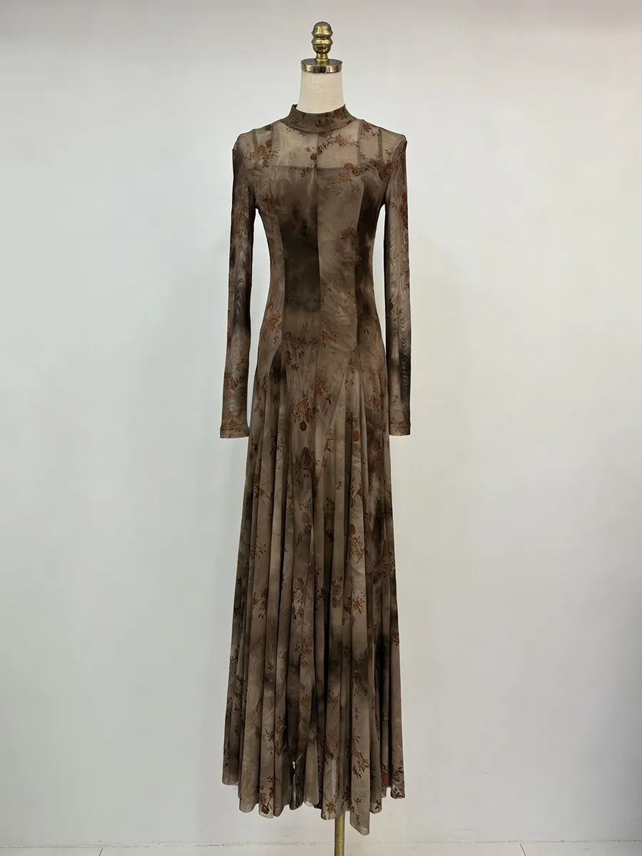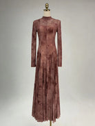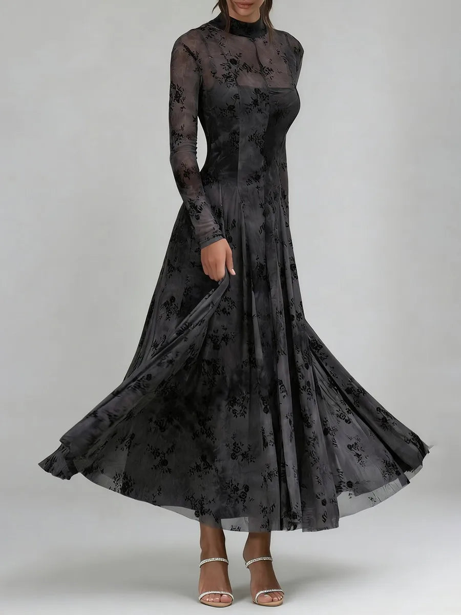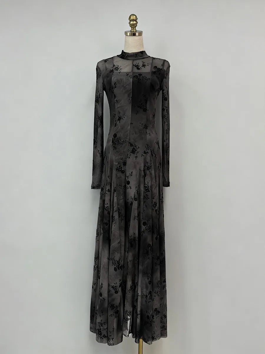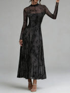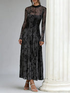Embrace timeless elegance with this vintage-inspired maxi dress, featuring delicate floral patterns rendered in luxurious mesh and velvet textures. The long sleeves provide sophisticated coverage while the flowing silhouette creates an effortlessly graceful line from shoulder to hem. Perfect for evening events, special occasions, or elevated everyday wear, this piece combines romantic detailing with refined construction. The interplay of mesh and velvet adds dimensional depth and visual interest, making it a versatile statement piece that transitions seamlessly from season to season.