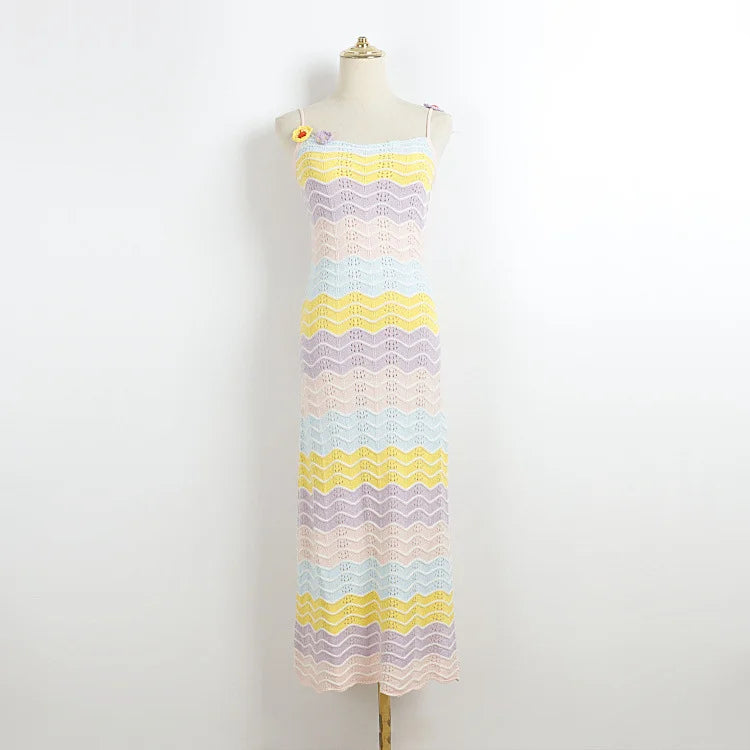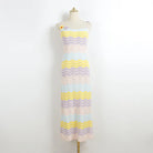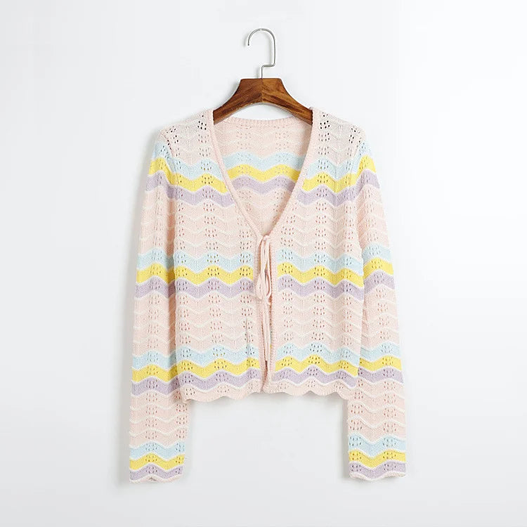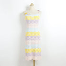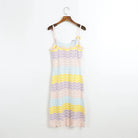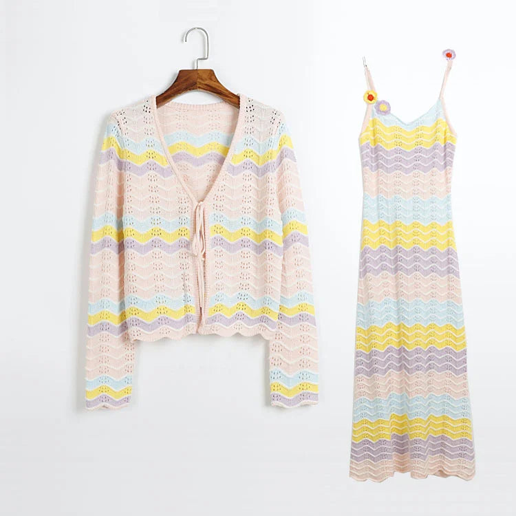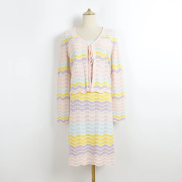 Add a touch of nostalgic charm to your wardrobe with the Trend4us Vintage Pastel Knit Two-Piece Set. Featuring a delicate open-knit cardigan with a front tie and a matching zigzag-striped cami dress, this set is designed with soft pastel hues of yellow, lavender, pink, and blue. Ideal for spring and summer, it's lightweight, breathable, and perfect for casual outings or vacation wear.