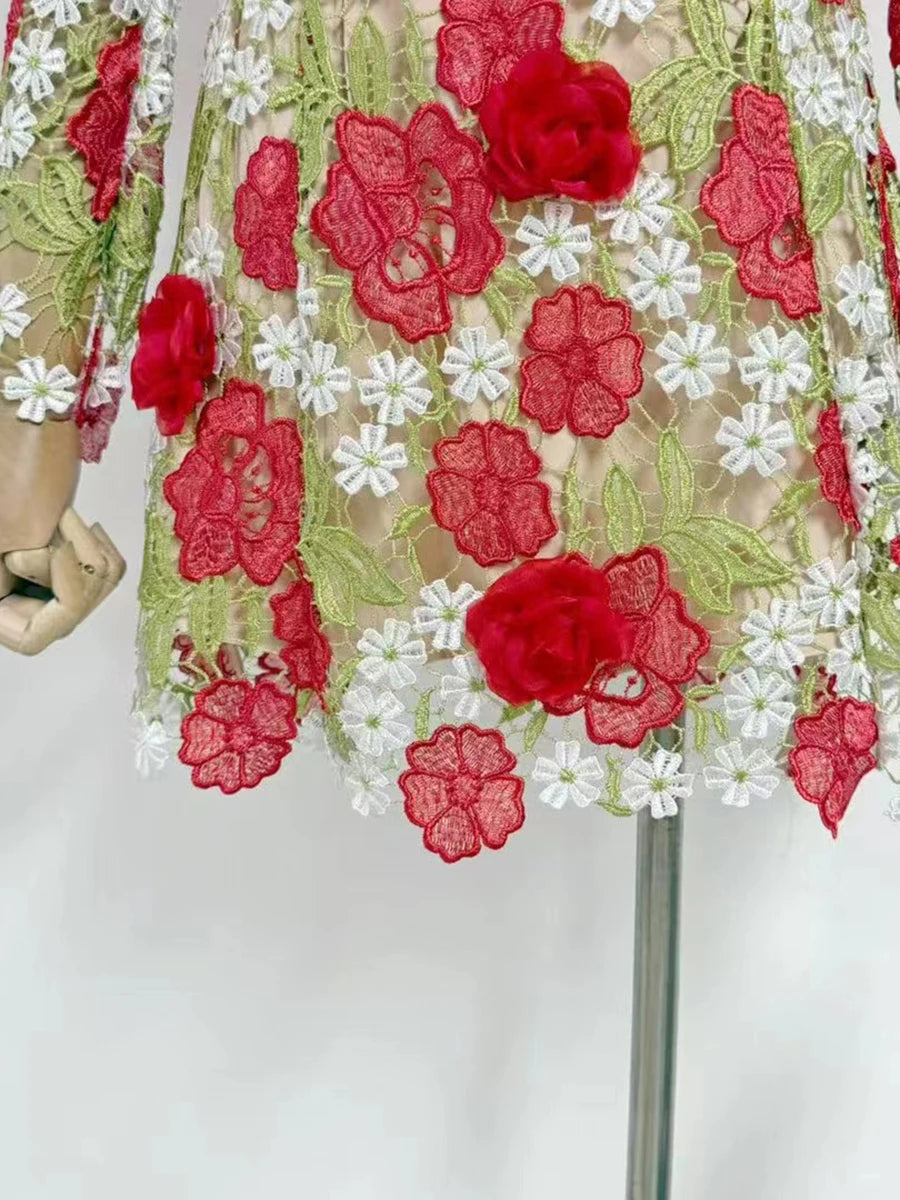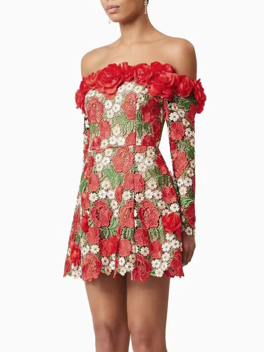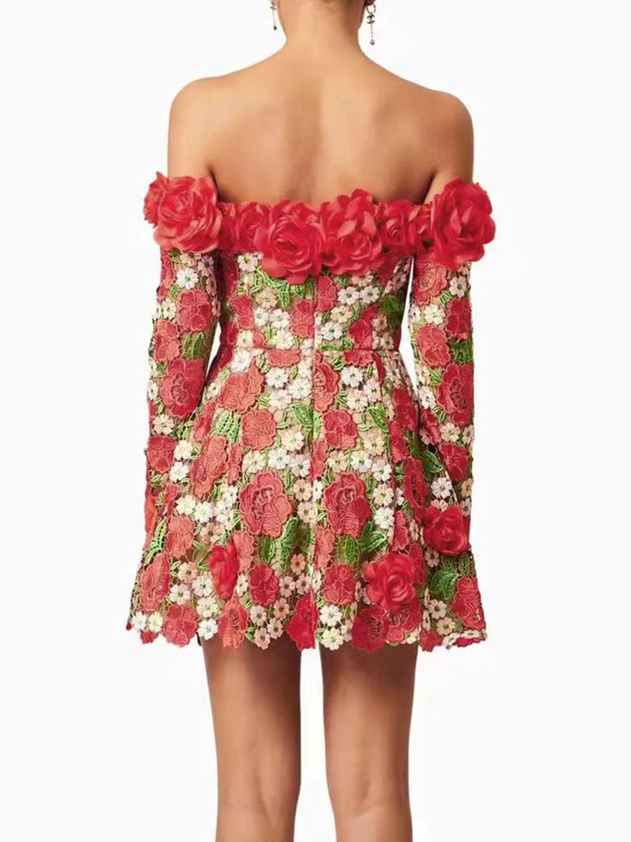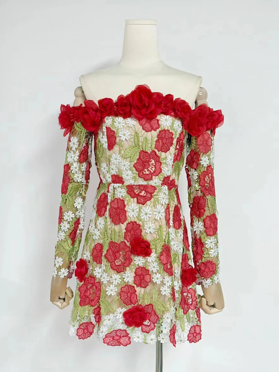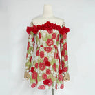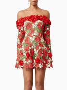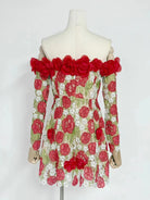 Make a statement with the Trend4us 3D Floral Appliqué Off-Shoulder Mini Dress. This captivating piece features intricate red and white floral appliqués with green leaf embroidery on sheer mesh. The off-shoulder neckline is adorned with dimensional rose accents, adding romantic elegance. Long sleeves and a flattering fit-and-flare silhouette complete the look—perfect for garden parties, romantic evenings, or bridal occasions.
