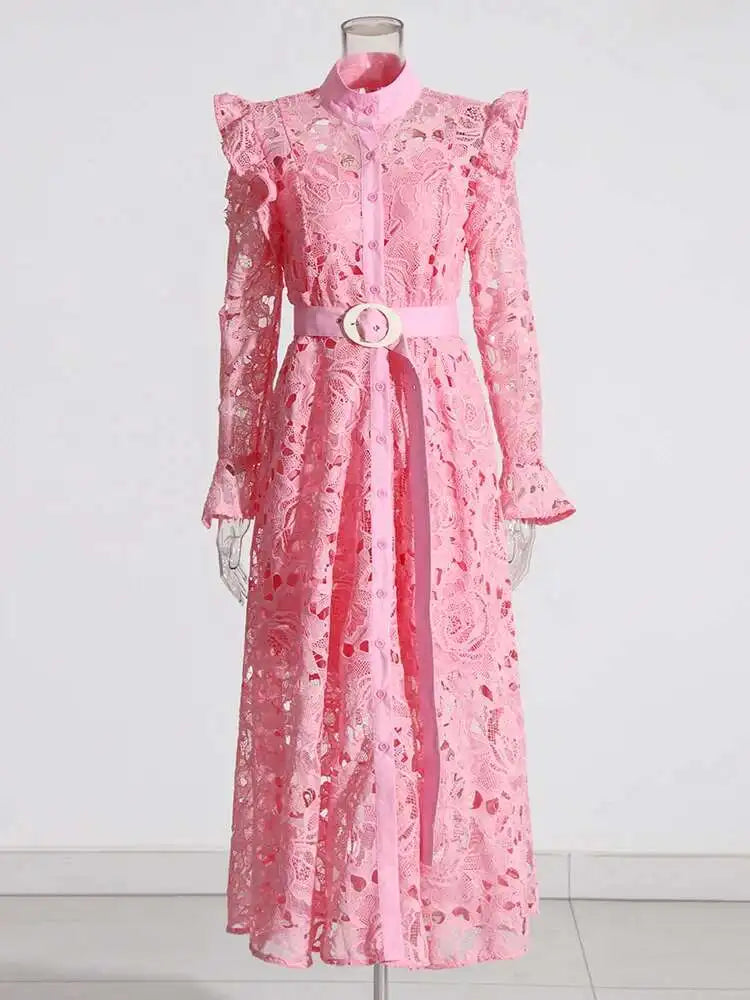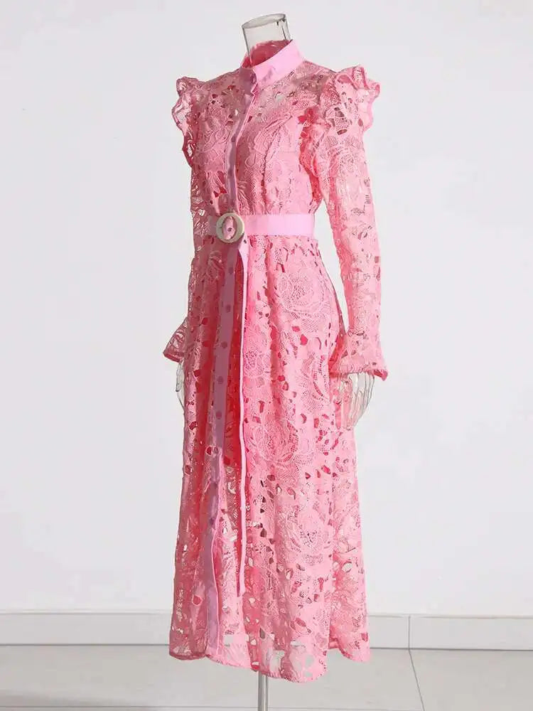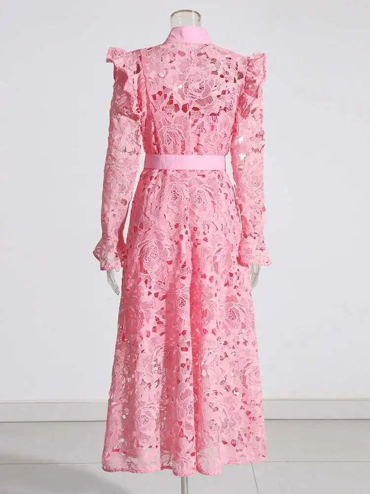 Make a graceful statement in the Trend4us Embroidered Ruffle Lace Belted Maxi Dress, a romantic fusion of vintage elegance and modern flair. This stunning maxi dress is crafted from intricately embroidered floral lace with semi-sheer panels that exude delicate charm. Designed with a high neckline, ruffled shoulders, and flared cuffs, it brings a regal touch to your wardrobe. The coordinated belt cinches the waist for a flattering silhouette, while the full-length skirt flows effortlessly for an ethereal finish. Perfect for special occasions, garden parties, or upscale events, this dress embodies timeless sophistication with a contemporary edge.