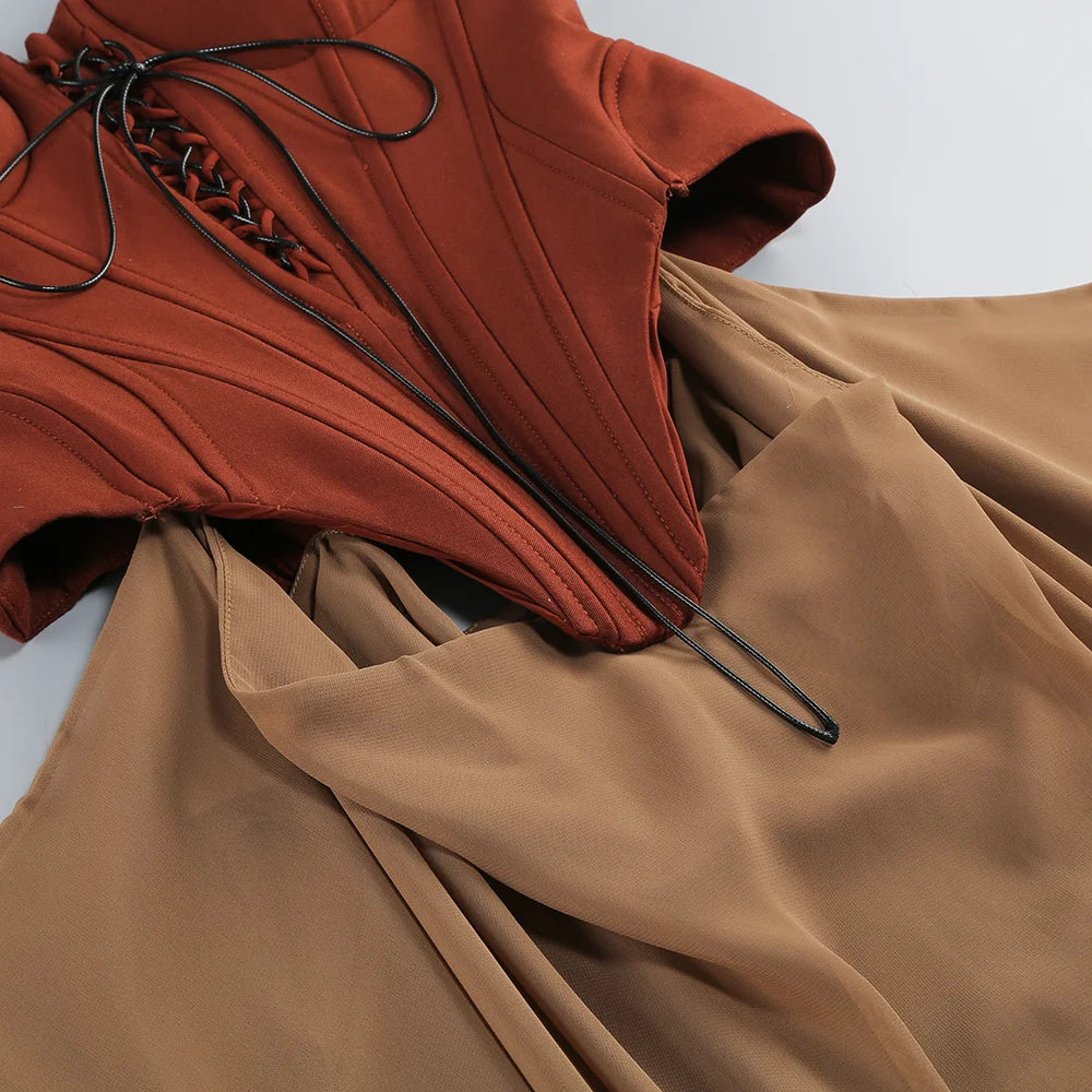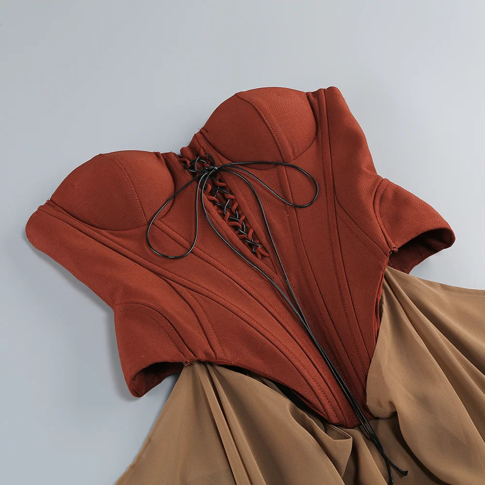 Trend4us Lace-Up Corset Sheer Panel Maxi Dress
