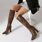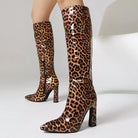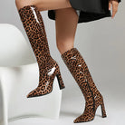 Make a fierce fashion statement with the Trend4us Leopard Patent Knee-High Boots. Featuring a bold leopard print on glossy patent faux leather, these boots are designed with a pointed toe, slim-fit shaft, and a sleek stiletto heel. The knee-high silhouette adds drama and edge—perfect for nights out, runway-inspired looks, or daring street style.