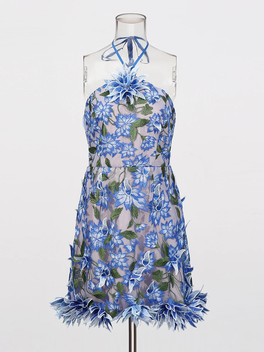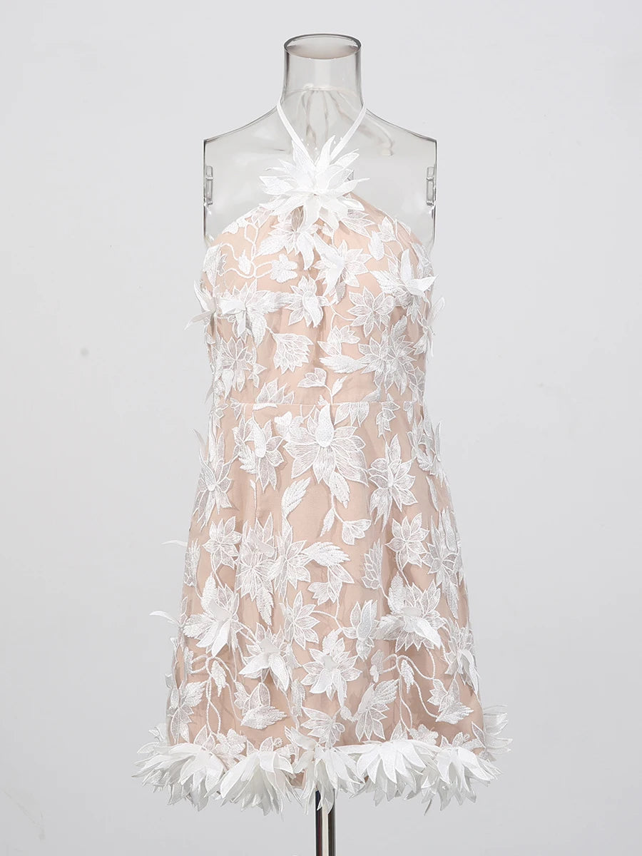 Trend4us Luxe 3D Floral Appliqué Halter Mini Dress