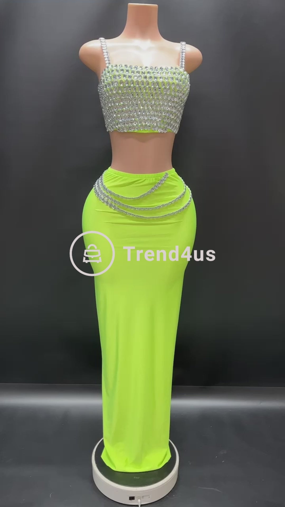 Turn heads with the Trend4us Luxe Crystal Crop Top & Skirt Set. Featuring a dazzling rhinestone-embellished crop top with adjustable straps and a figure-hugging maxi skirt adorned with layered crystal chains, this set is designed for glamorous evenings, red carpet moments, or statement party looks. The stretchy fabric ensures a sleek fit, while the back zip closure adds comfort and ease.
