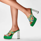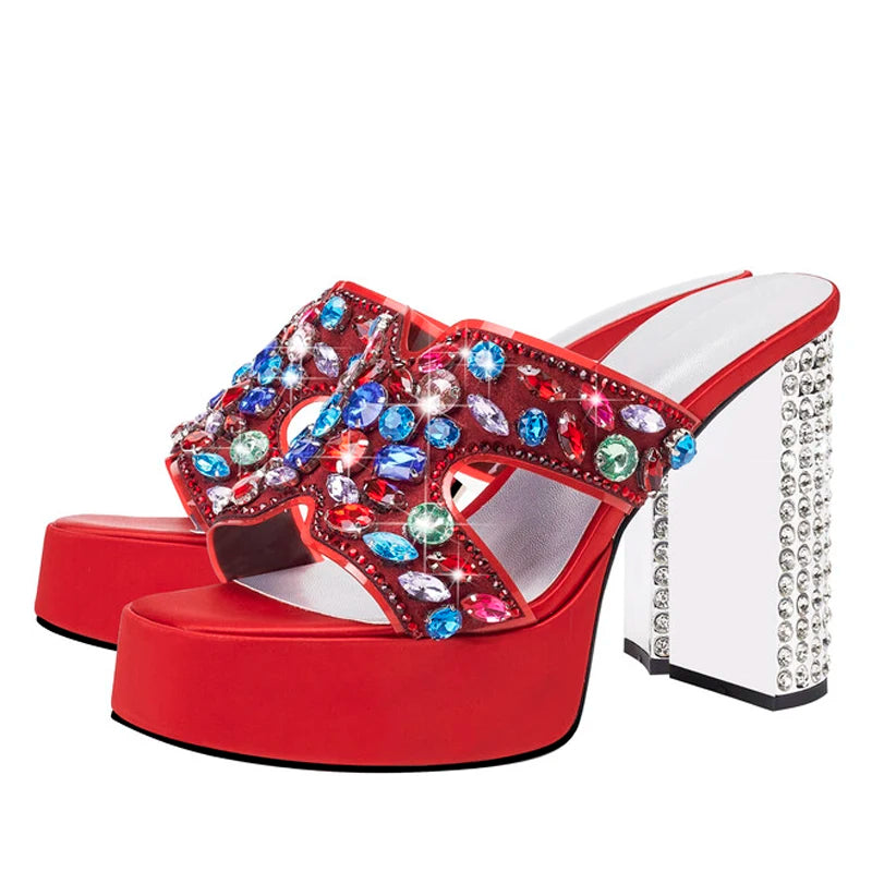Step into glamour with the Trend4us Luxe Gemstone Platform Slide Heels. These bold open-toe slides feature a high platform sole and chunky heel, adorned with oversized multicolor gemstone embellishments for a striking statement. Designed for comfort and style, the slip-on silhouette is perfect for events, parties, or elevating everyday fashion with a luxe twist.