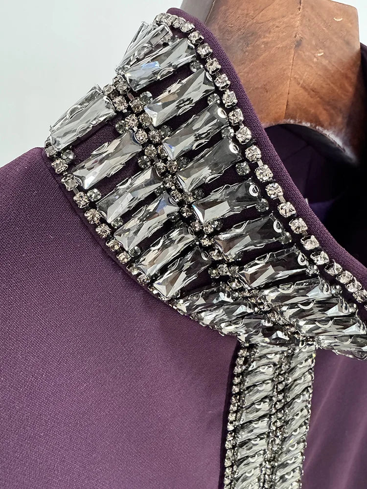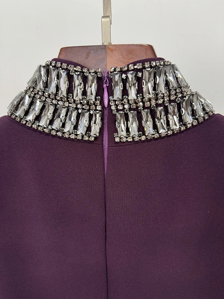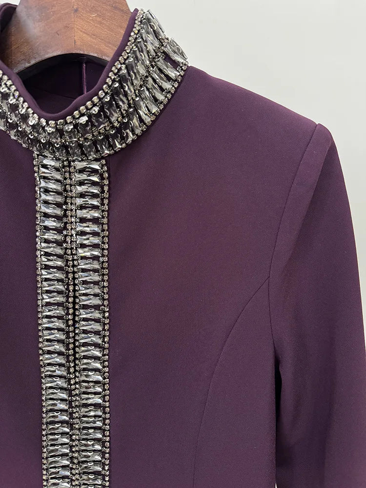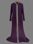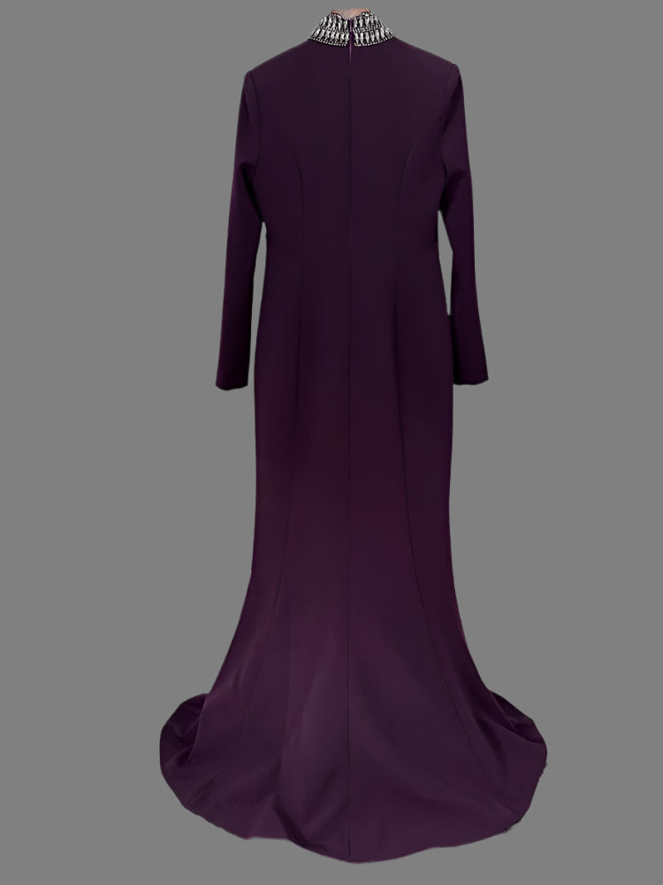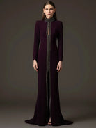 Exude power and elegance in the Trend4us Luxe High-Collar Embellished Front Slit Gown, a commanding silhouette designed to captivate. This deep plum gown features a structured high collar and long sleeves, creating a refined and sophisticated profile. A striking crystal-embellished trim extends from neck to hem, framing a dramatic front slit and keyhole neckline that add a bold touch of allure.
