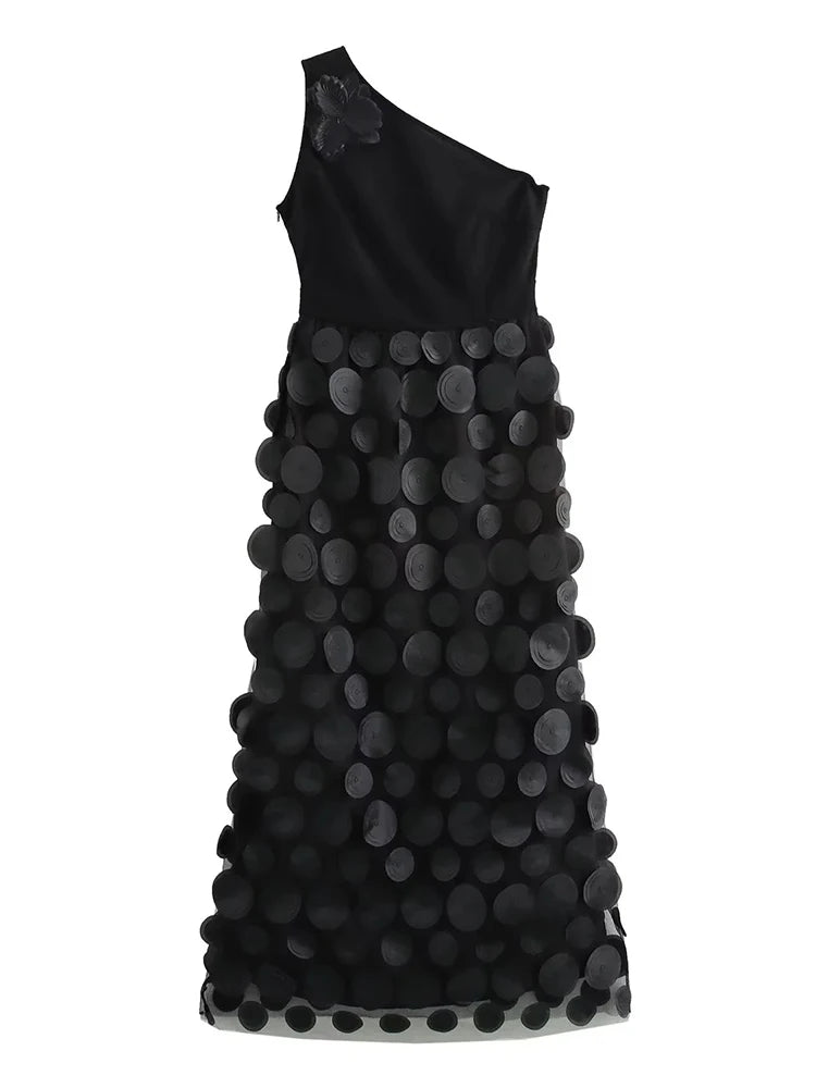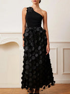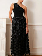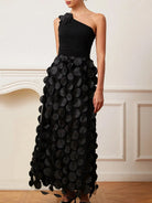 Make a bold statement with the Trend4us Luxe One-Shoulder 3D Appliqué Maxi Dress – a stunning piece that seamlessly blends elegance with avant-garde fashion. This breathtaking gown features a one-shoulder neckline adorned with a delicate 3D floral appliqué, adding a touch of feminine charm. The standout feature of this dress is the voluminous maxi skirt, embellished with eye-catching 3D circle appliqués cascading down the entire length, creating a dramatic and artistic effect.