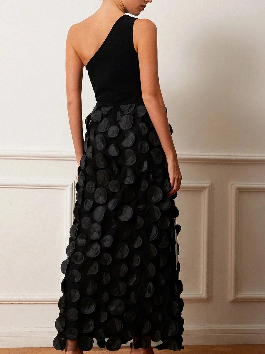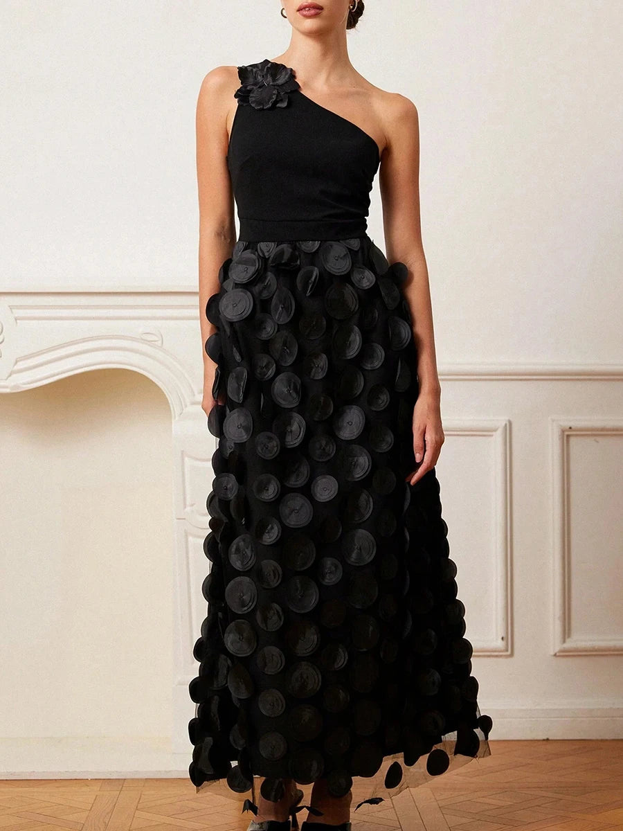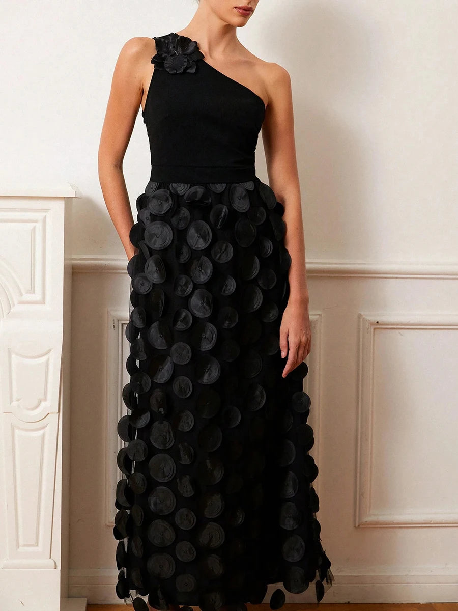 Trend4us Luxe One-Shoulder 3D Appliqué Maxi Dress