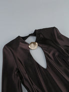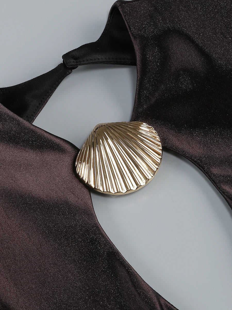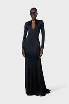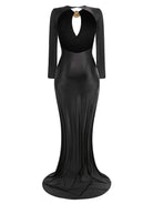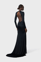 The design features a dramatic open back, a front teardrop keyhole cutout, and a statement metallic shell clasp at the neckline, blending architectural artistry with refined glamour. Long sleeves balance the bold details, while the extended hemline creates a sweeping, statuesque finish.