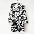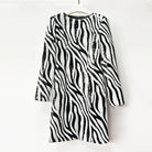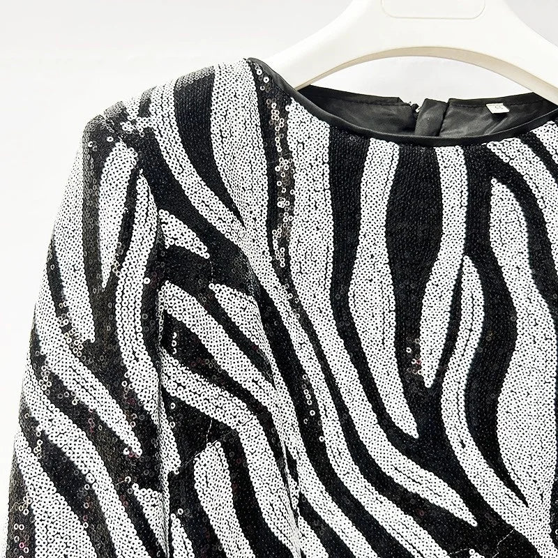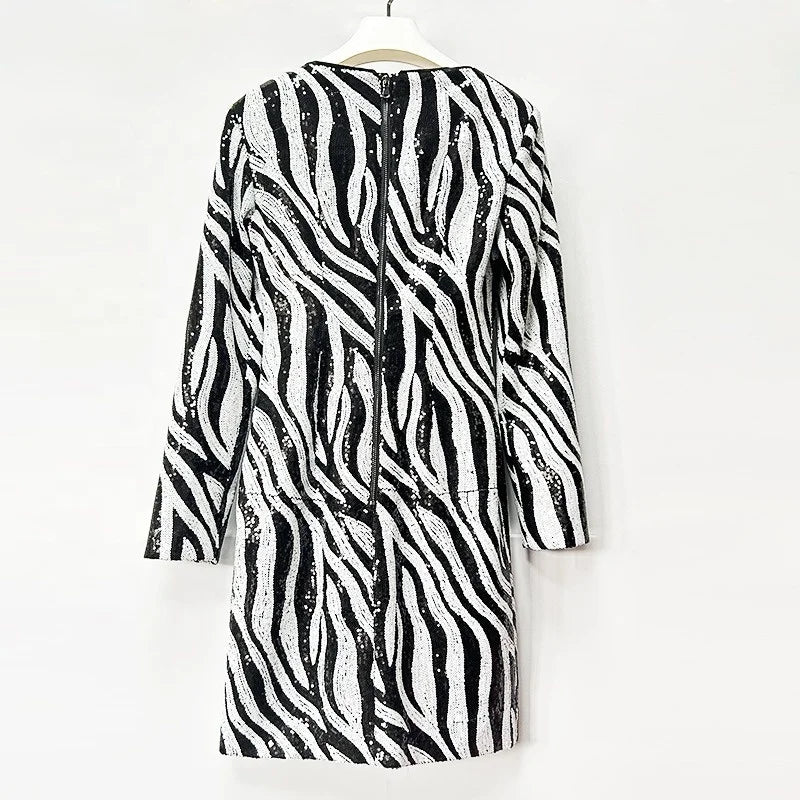 Make a bold entrance in the Trend4us Sequin Zebra Print Long Sleeve Mini Dress, a dazzling fusion of wild style and glamour. This fitted mini dress features an eye-catching black and white zebra pattern fully embellished with sequins for high-shine impact. Designed with long sleeves, a crew neckline, and a back zipper closure, it offers a sleek, structured silhouette perfect for parties, nightlife, and standout occasions.