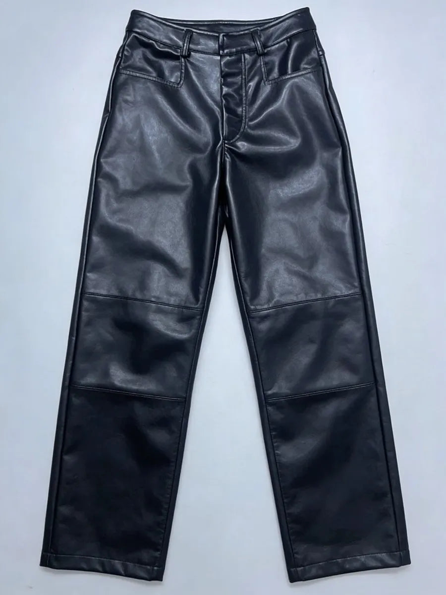 The Trend4us Sleek High-Waisted Faux Leather Straight-Leg Pants are a modern essential designed to elevate any wardrobe with effortless edge. Crafted from smooth faux leather with a subtle sheen, these pants feature a flattering high-rise waist and clean straight-leg silhouette that elongates the frame. Structured paneling and classic pocket detailing deliver a polished finish, making them perfect for day-to-night styling—from casual streetwear to elevated evening looks.