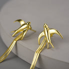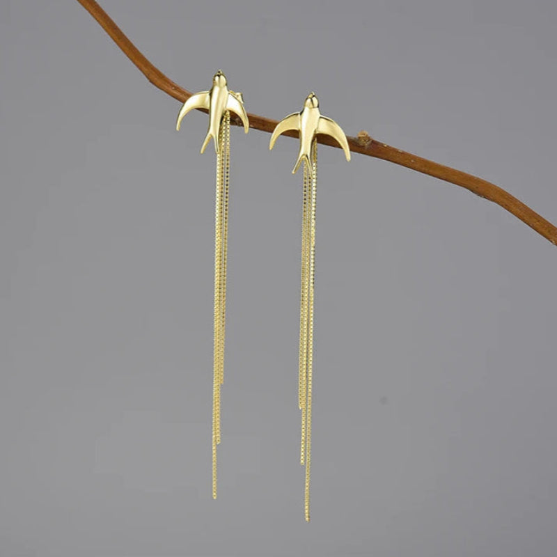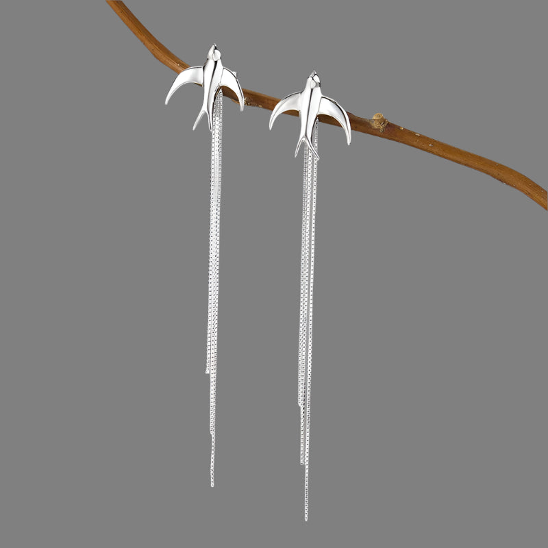 Elevate your accessory game with the Trend4us Swallow Dangle Earrings with Long Chain Tassels. Featuring a graceful swallow design, these earrings symbolize freedom and elegance, while the delicate long chain tassels add captivating movement and shine. Available in both silver and gold finishes, they are perfect for adding a touch of sophistication to evening outfits, formal wear, or chic everyday looks. Lightweight and comfortable, these earrings will make you feel effortlessly stylish from day to night.