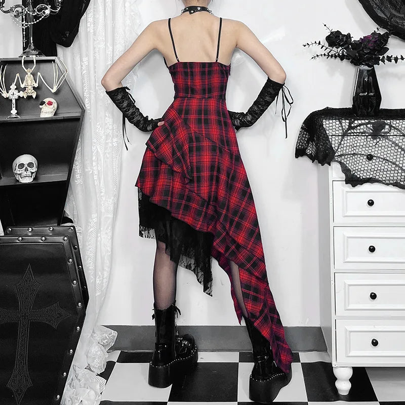 Unleash your gothic charm with the Trend4us Women's Gothic Plaid Asymmetrical Lace-Trim Dress. This edgy dress features a bold plaid pattern, delicate lace trim, and a striking asymmetrical hem. Designed with a fitted bodice and adjustable straps, it's perfect for making a statement at alternative events or adding a unique touch to your everyday style.